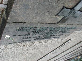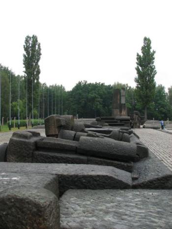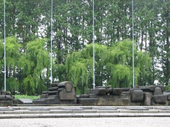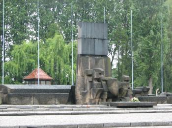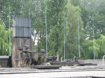 Na końcu torów kolejowych wznosi się rozłożysty Międzynarodowy Pomnik Ofiar Faszyzmu.