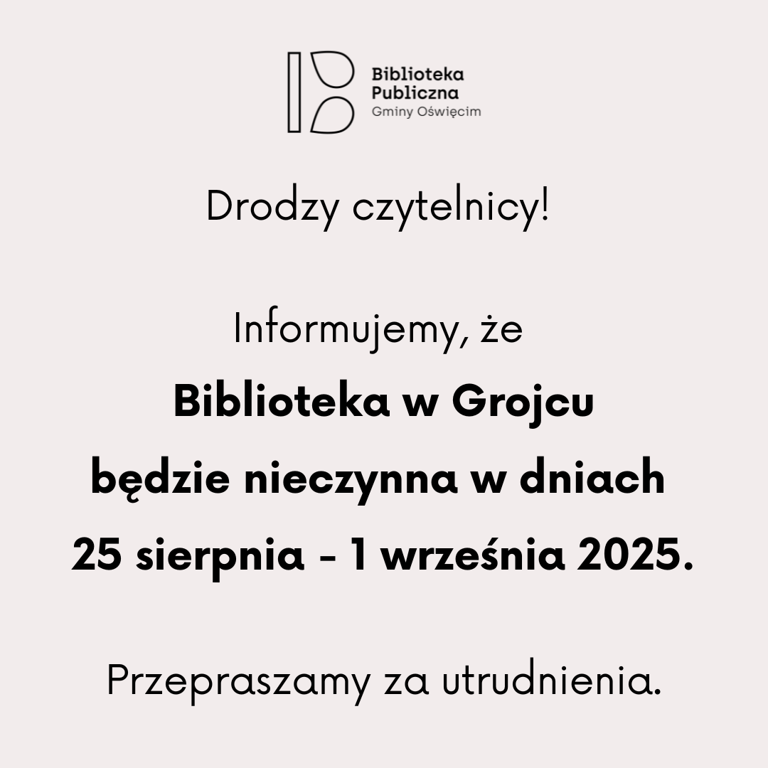 Informujemy, że Biblioteka w Grojcu będzie nieczynna w dniach 25 sierpnia 2025 - 1 września 2025.