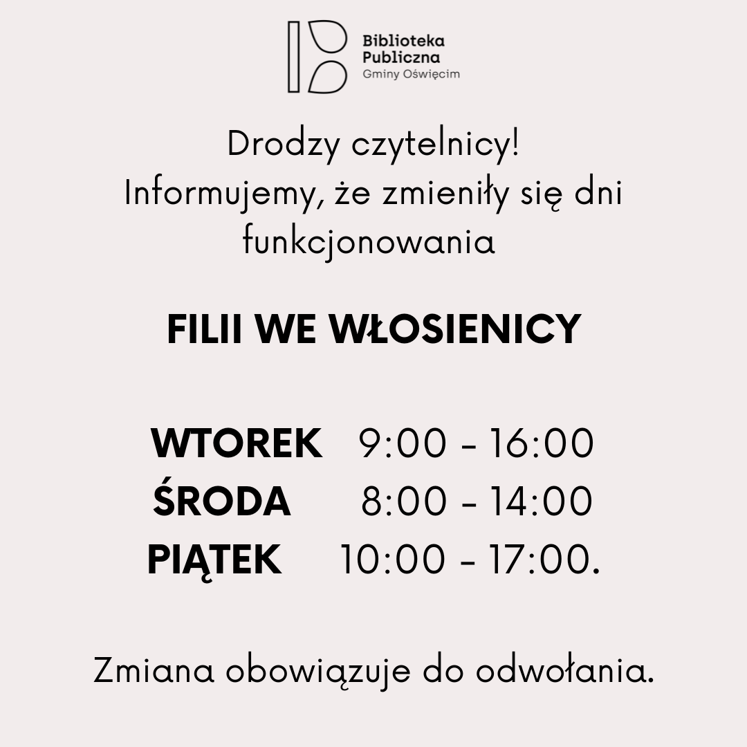 Informujemy, że uległy zmianie dni otwarcia Filii we Włosienicy.