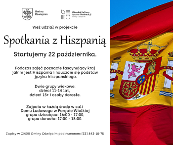 Ośrodek Kultury, Sportu i Rekreacji Gminy Oświęcim serdecznie zaprasza mieszkańców gminy Oświęcim w wieku 11+ do udziału w projekcie "Spotkania z Hiszpanią". Początek cyklu 22 października br. Zajęcia w każdą środę do dnia 17 grudnia.